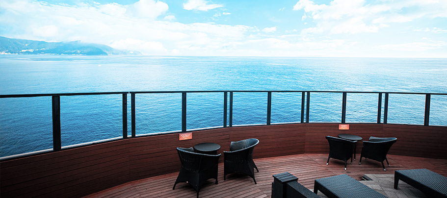 チェックインでは、ラウンジさざ波でおくつろぎいただいたり、風の薫の中でも一番の絶景スポット空中庭園や